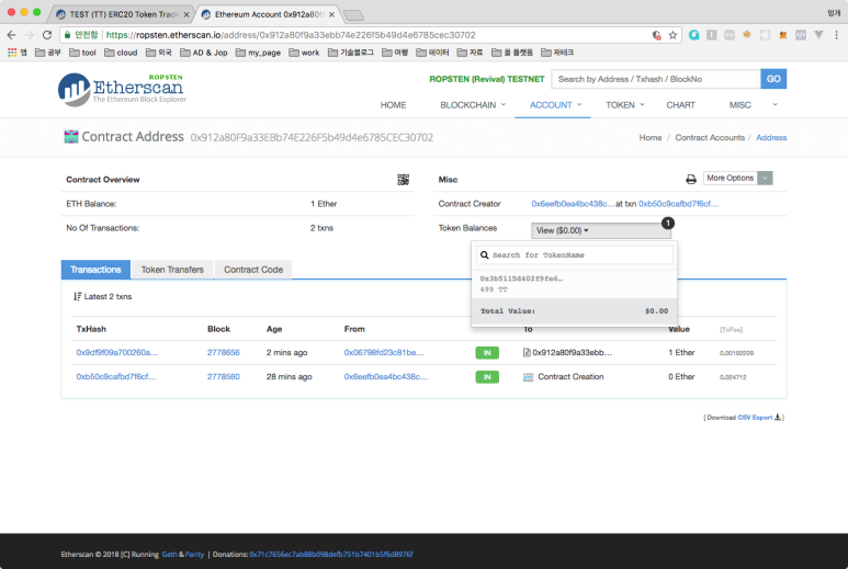 토큰이 발행되면 개인 지갑과 etherscan에서 확인 가능합니다.