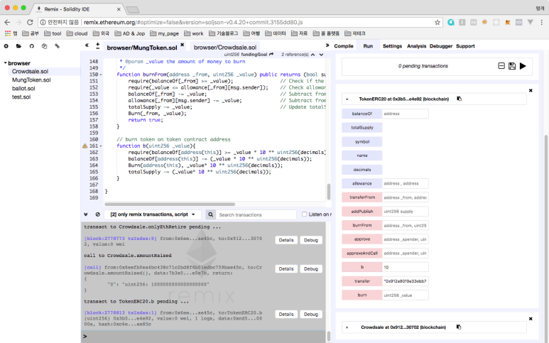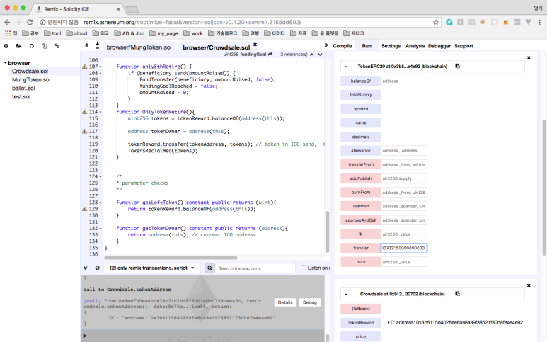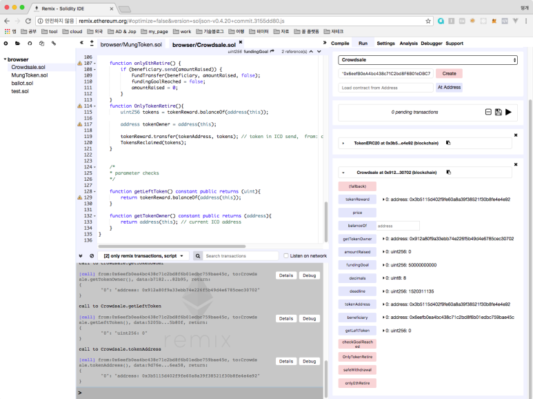 여기서는 이더와 토큰 환급을 분리했지만 실제로는 하나로 합칩니다. 세일즈 종료버튼을 누르면 두개의 기능을 모두 실행하면 됩니다.