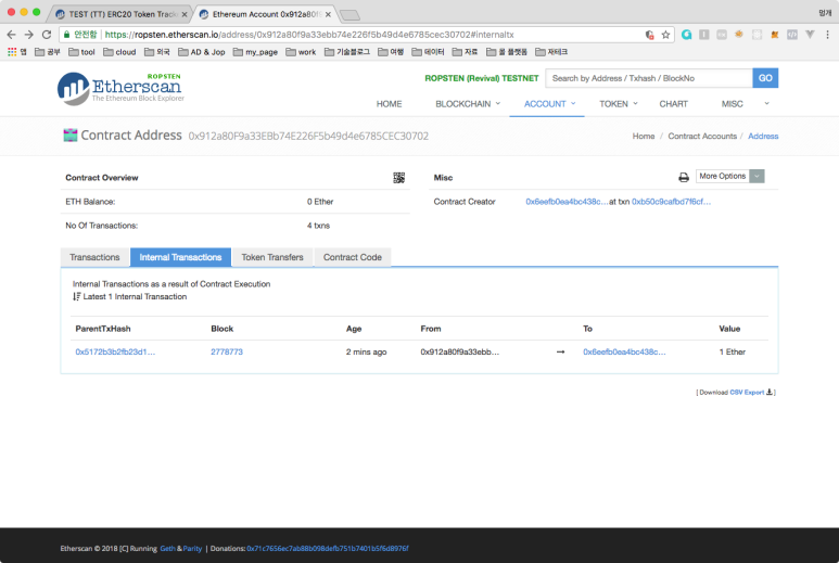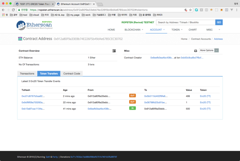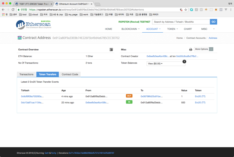 ICO에 있던 모든토큰이 컨트랙트 주소를 빠져나가 토큰 컨트랙트 주소로 옮겨졌습니다. IN은 토큰이 들어온것이고, OUT은 토큰이 빠져나간 것 입니다.