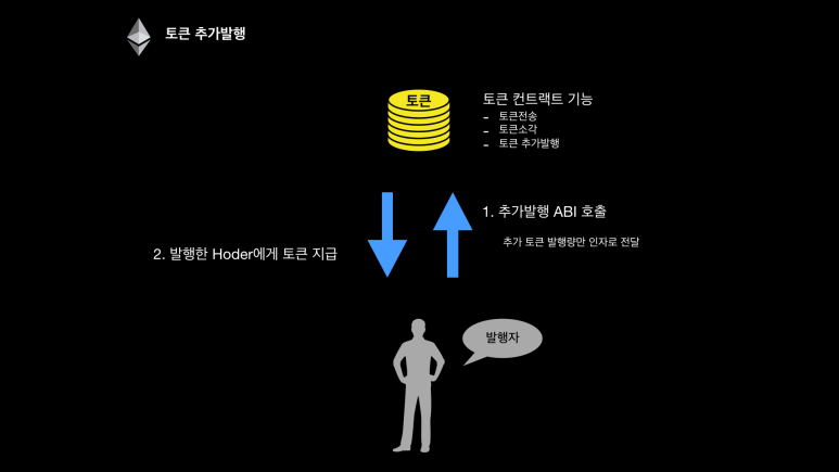 발행자는 토큰에있는 추가발행 ABI를 호출합니다. 그럼 토큰 컨트랙트는 발행자에게 생성된 토큰을 전달합니다.