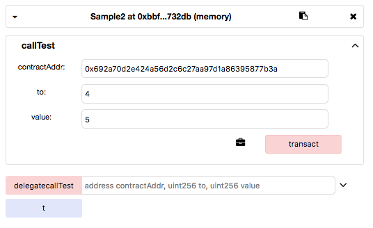 이번에는 Sample2로 배포된 컨트랙트에서 delegatecallTest를 호출해보겠습니다. callTest와 똑같이 넣어줍니다. 첫 번째 인자는 Sample1로 배포된 컨트랙즈 주소 두 번째와 세 번째 인자는 Sample2에서 호출할 test 함수로 전달할 인자를 넣어줍니다.