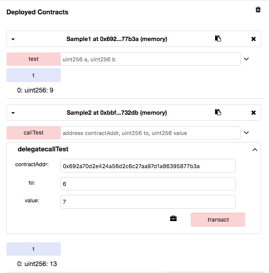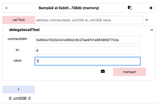 Sample1로 배포된 컨트랙트 test()에서 t = a + b를 할 때 call을 하게되면 Sample1에 있는 t에 접근하여 값을 변경을 하고 delegatecall을 하게되면 context가 Sample2가 유지 되기 때문에 Sample2로 배포된 컨트랙트에 있는 t의 값이 변경되게 됩니다.