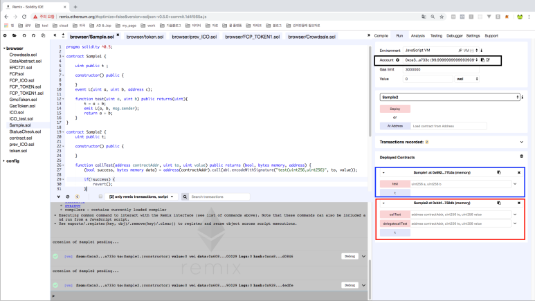 앞의 사진에서 검정, 파랑, 빨강박스 순으로 트랜잭션 호출자, sample1 컨트랙트, sample2 컨트랙트 입니다.