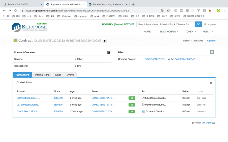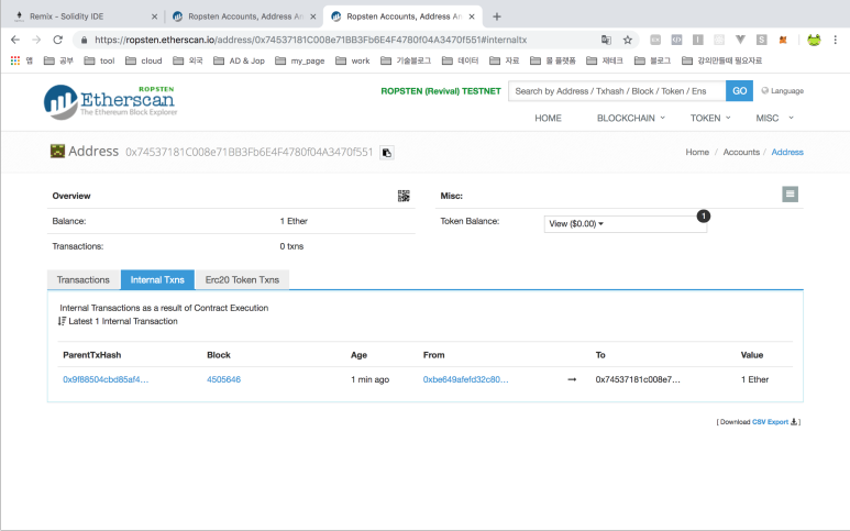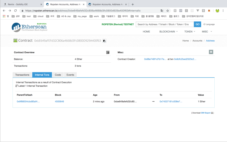 transaction의 경우는 지갑을 통해서 주고 받은 이더가 표시되고 컨트랙트 내부에서 전송이 발생된 경우는 internal Txns에서 몇 이더를 전송했는지 확인 가능합니다.