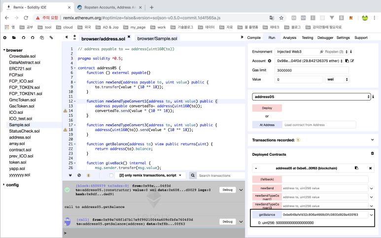 현재 컨트랙트에 존재하는 이더리움중 일부를 해당 계정으로 전송해보겠습니다.