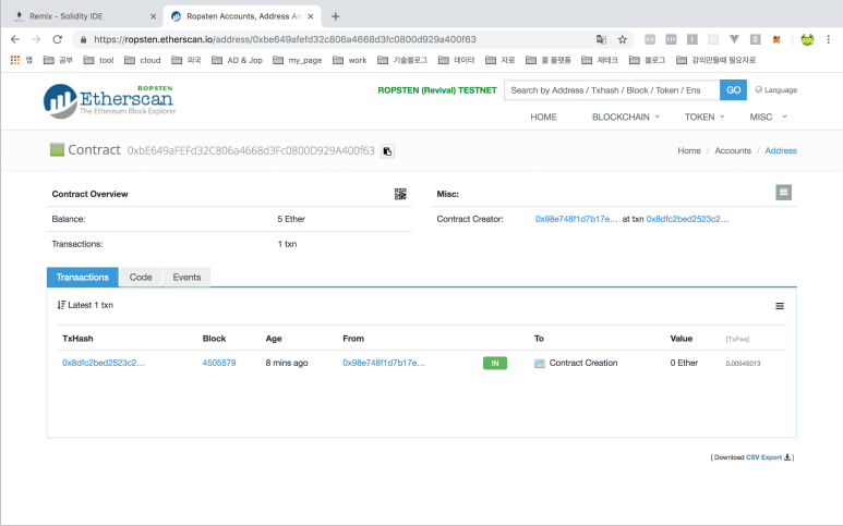 5이더를 배포된 컨트랙트에 전송해줍니다.